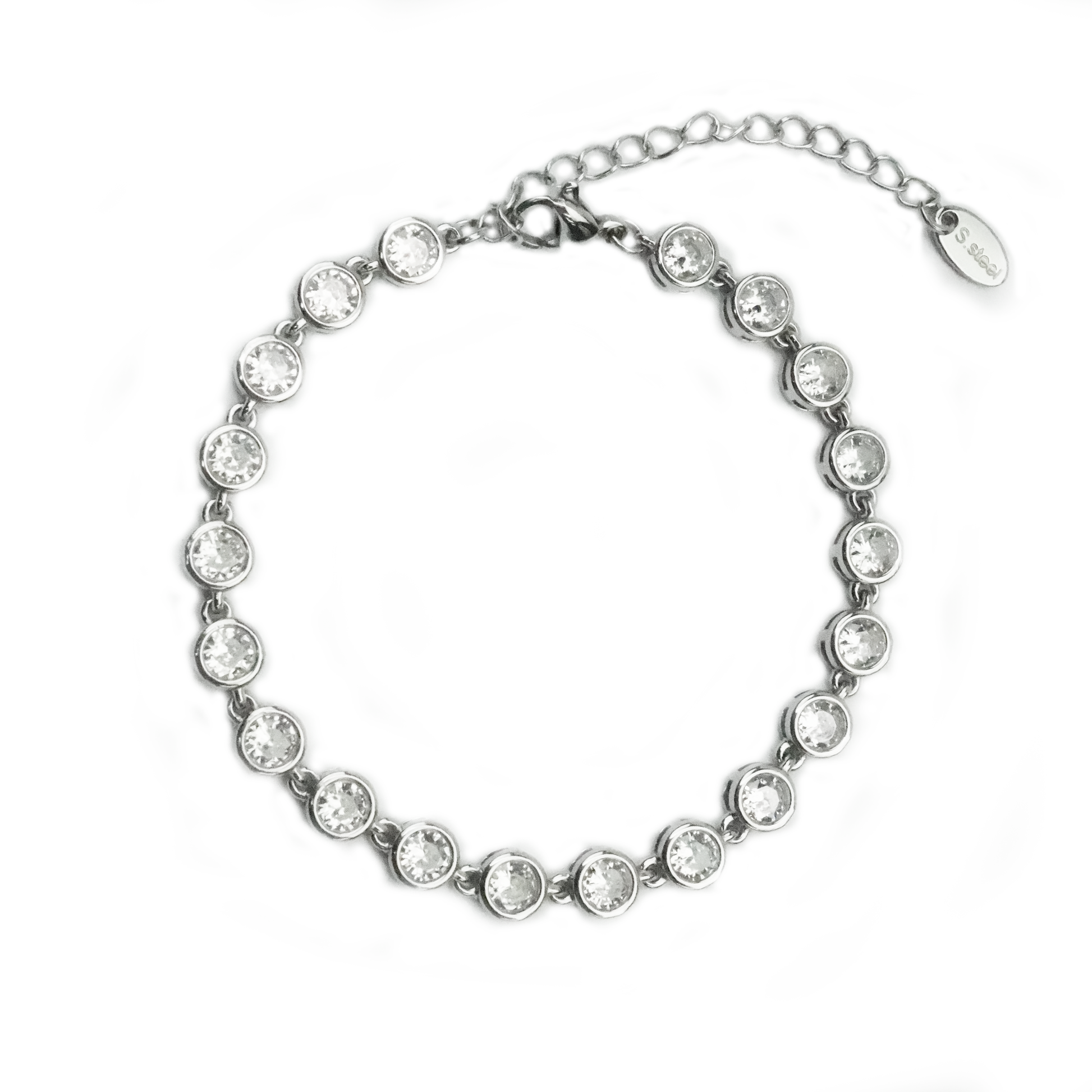 The Lumière Silver Bezel Bracelet brings effortless sophistication with its sleek silver tone and luminous white zirconia crystals. Each round-cut stone is bezel-set in polished stainless steel, creating a smooth, refined finish that sparkles subtly with every move.